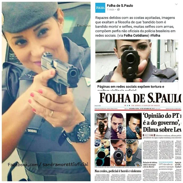 Ao invés de falar de pessoas que fazem seu trabalhos honestos, e de heróis como é o caso da POLICIAL MILITAR SANDRA MORETTI, mas, usam a primeira página do jornal para denegrir a imagem de uma profissional por causa de uma foto que ela postou nas redes sociais, se fossem, fotos de bandidos com fuzil ou um professor que disse querer o fim da classe média não fariam isso, agora numa covardia usar uma página para distorcer os fatos, o perfil é dela senhores ela publica o que quiser e vocês não tem nada haver com isso.